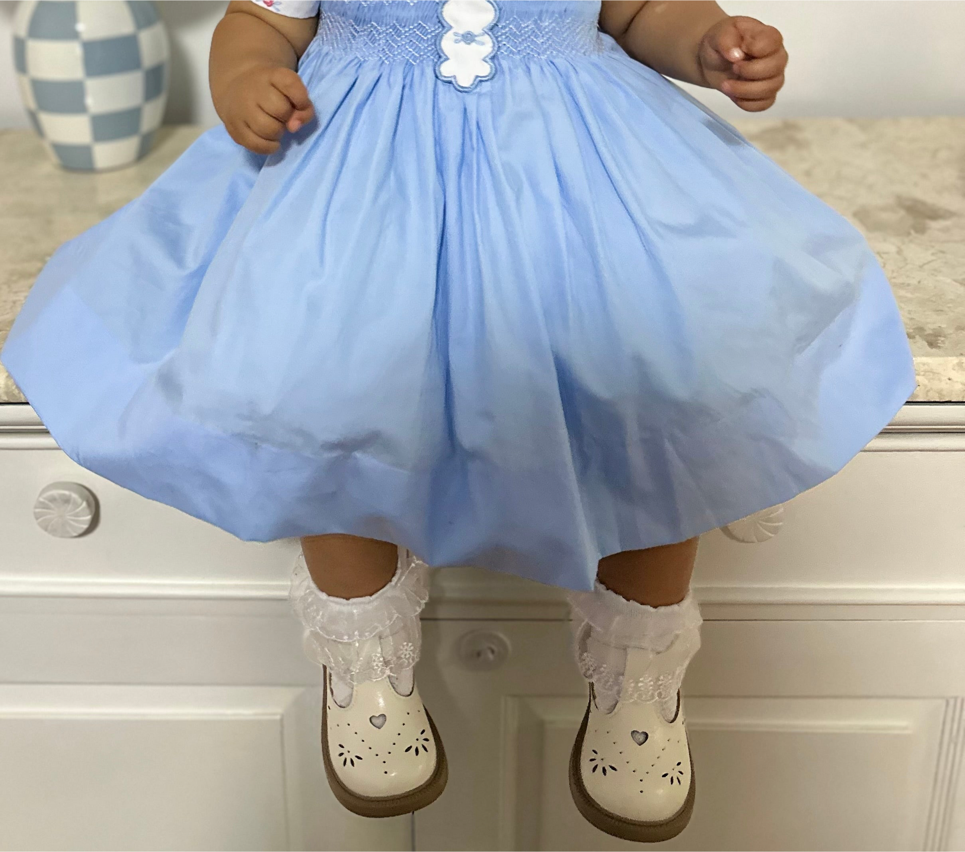The Blossom Dreams Bloom Dress is the perfect piece to celebrate life’s most cherished moments. Crafted from soft, breathable 100% cotton with a delicate layer of tulle for added volume and elegance, this heirloom-quality design features a hand-smocked bodice adorned with tiny embroidered flowers. The scalloped Peter Pan collar and puff sleeves add a timeless vintage charm, making it ideal for birthdays, special occasions, and family portraits.