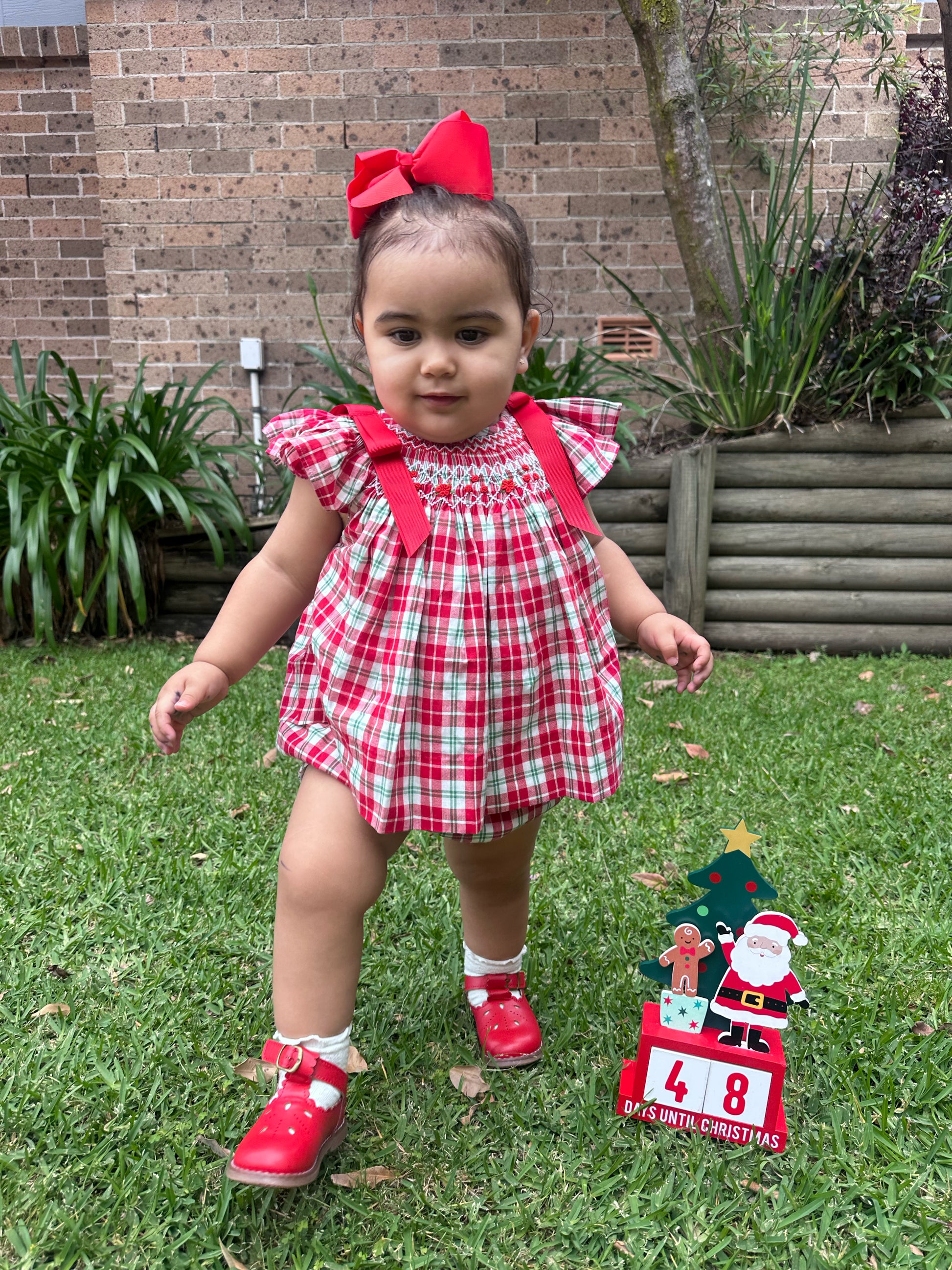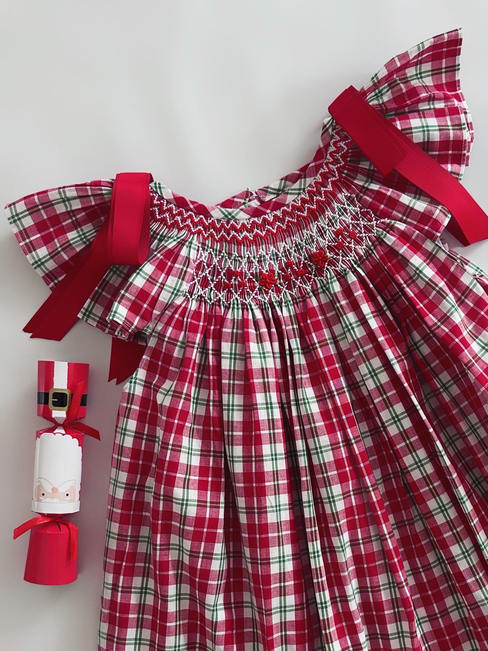 Our Christmas Tartan Smocked Set is a festive classic designed to bring timeless charm to your little one’s holiday wardrobe. Featuring a beautifully hand-smocked bodice with red and green threadwork over traditional tartan checks, this set perfectly captures the spirit of Christmas. The flutter sleeves with red bows add a sweet, elegant touch, while the matching bloomers ensure comfort and style for every celebration and photo moment.