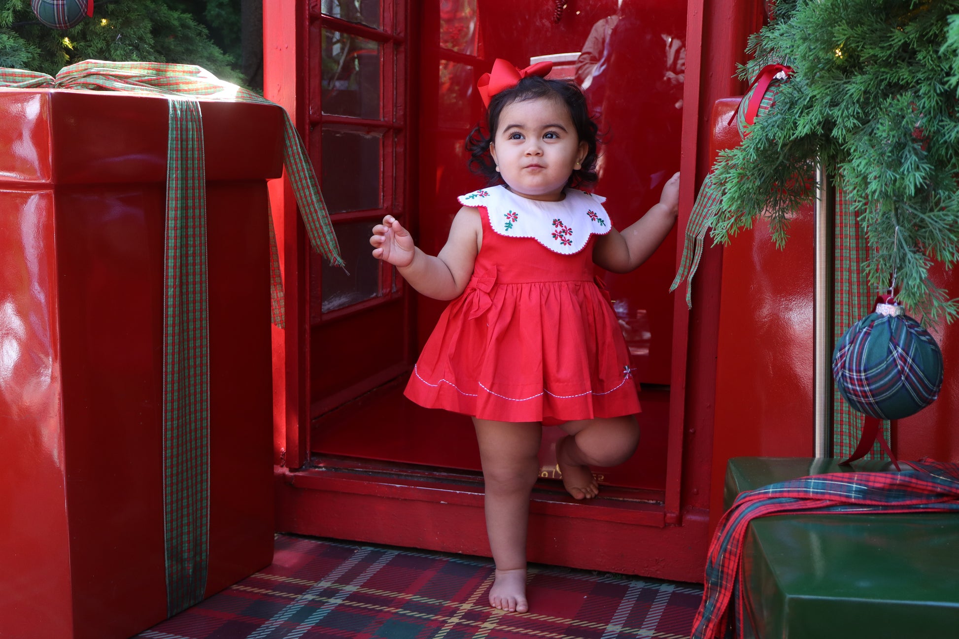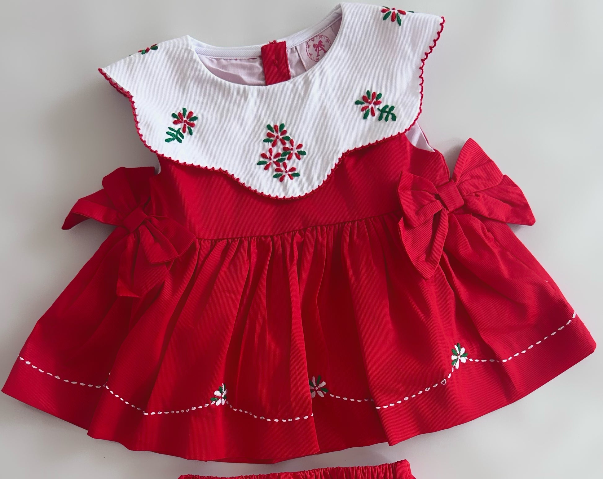 Our Holly Joy Set is the sweetest Christmas outfit for your little one. This two-piece ensemble features a vibrant red dress with a beautifully hand-embroidered white collar, adorned with festive holly details. The soft cotton fabric allows comfort and breathability, while the delicate bows on each side add a charming touch of elegance. The matching bloomers complete the timeless holiday look — perfect for Christmas photos, family gatherings, and all the season’s celebrations.