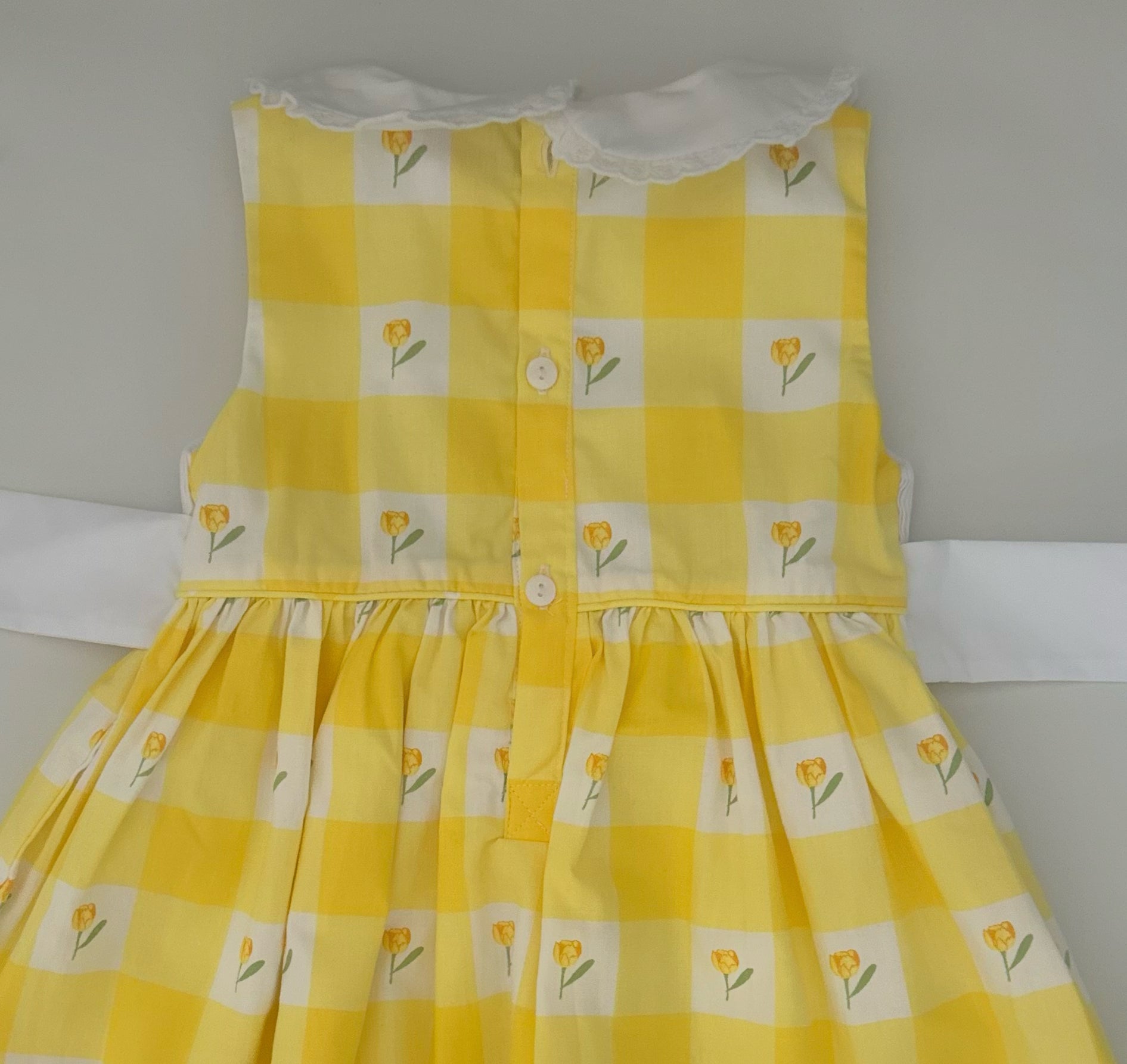 Featuring a sweet yellow gingham print with tiny tulip details, the dress showcases a hand-smocked bodice with delicate floral embroidery, adding an heirloom-quality finish. The white Peter Pan collar with lace edging brings a classic vintage touch, while the full gathered skirt is finished with a white hem and fine lace trim.